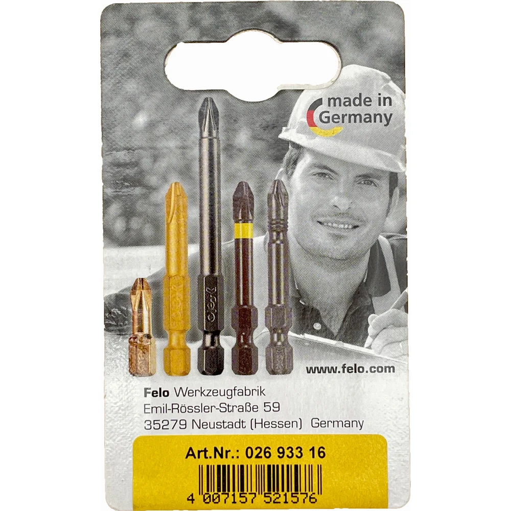 Биты Felo изготовлены из высококачественной инструментальной стали (CrMoV), закаленной в масле, поэтому обладают повышенной твердостью и устойчивы к высоким нагрузкам. Кованая часть бит не стачивается, поэтому при закручивании крепежа насадка не проворачивается в шляпке.