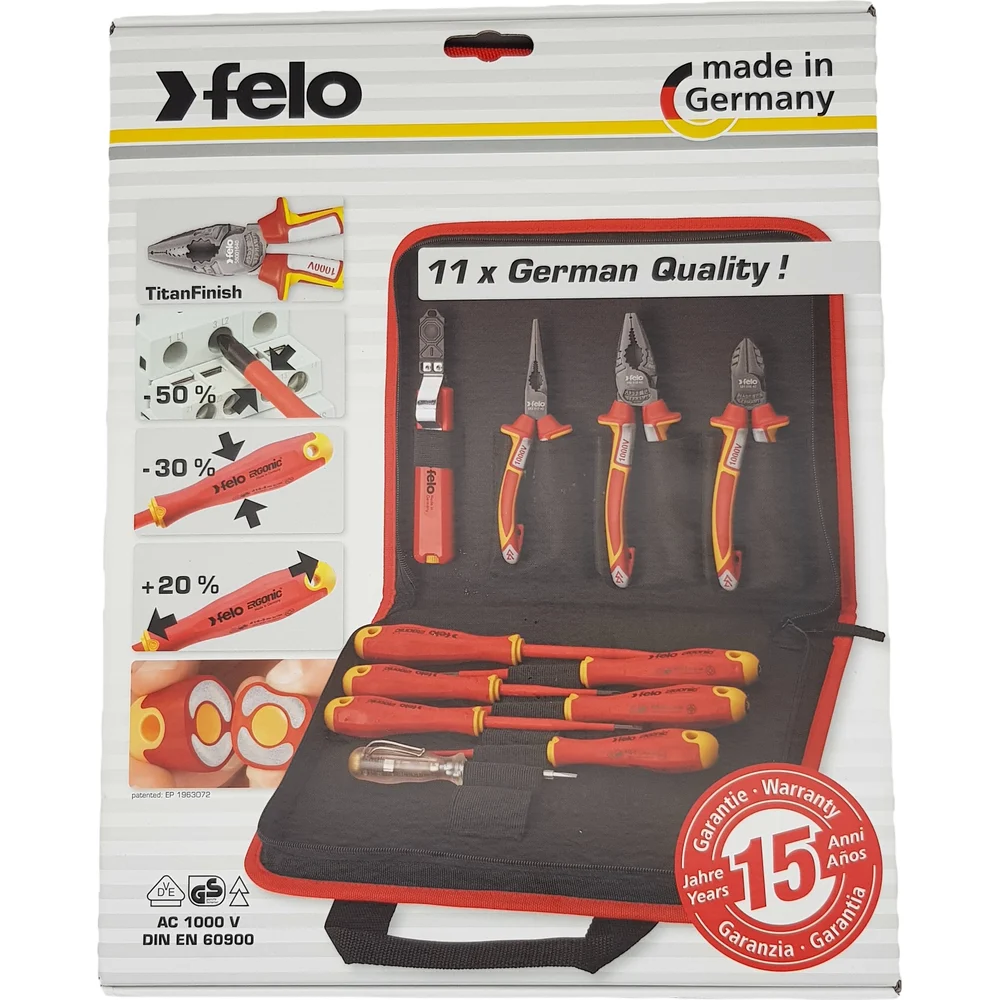 Набор диэлектрических отверток SL/PH/PZ E-Slim, бокорезов, плоскогубцев, длинногубцев, стриппера и отвертки тестера напряжения сети в сумке Felo ERGONIC 41381104 — детальное фото